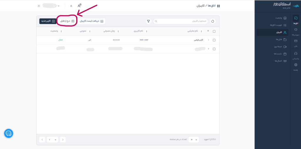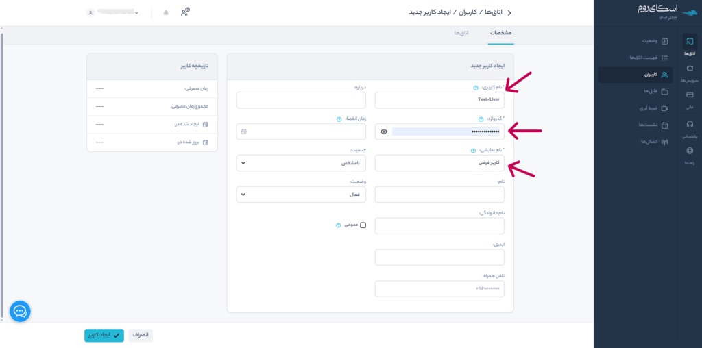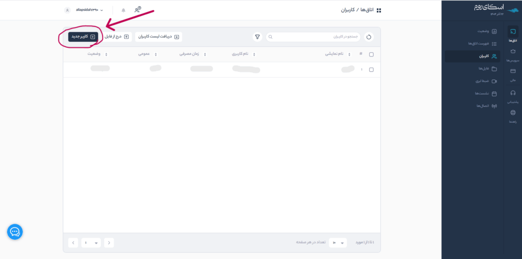 پس از پر کردن اطلاعات و انتخاب نوع سرویسی که خریداری کردهاید، روی گزینه «ایجاد اتاق» کلیک کنید. پس از کلیک روی این دکمه، وارد بخش کاربران میشوید. اگر در بخش «کاربران»، برای شرکتکنندگان نام کاربری و رمز عبور ساختهاید، در این قسمت میتوانید آن نام کاربری ساخته شده را به اتاق متصل کرده تا فقط افراد مجاز، وارد کلاس شوند.