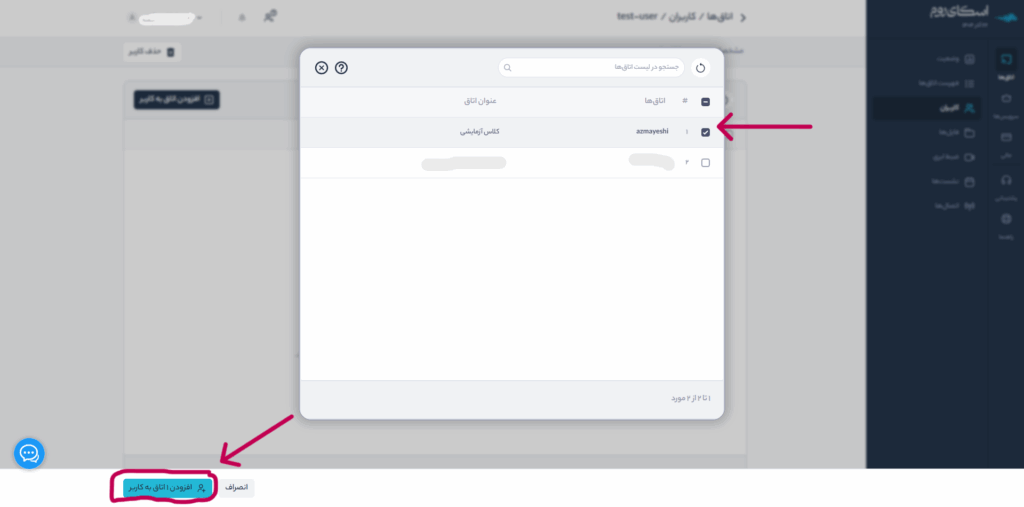 پس از کلیک روی آن گزینه، در پنجره جدید میتوانید نام کاربری ساخته شده را به یک یا هر چند اتاقی که در اسکایروم ایجاد کردهاید، اضافه کنید. توجه داشته باشید که باید تیک مربوط به کلاسی که میخواهید این نام کاربری و رمز عبور روی آن ایجاد شود را انتخاب کرده و سپس گزینه «افزودن اتاق به کاربر» را از پایین تصویر کلیک کنید.