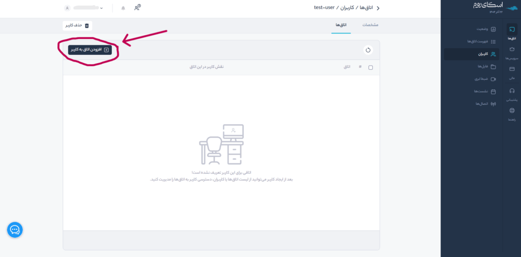 پس از پر کردن موارد خواسته شده فوق، با کلیک روی گزینه «ایجاد کاربر»، وارد صفحه اتاقها میشوید که در ابتدا خالی است. برای معرفی این نام کاربری و رمز عبور ساخته شده به اتاقی که در مرحله قبل ایجاد کردهاید (یا هر اتاقی که از قبل داشتهاید)، باید روی گزینه «افزودن اتاق به کاربر» کلیک کنید.