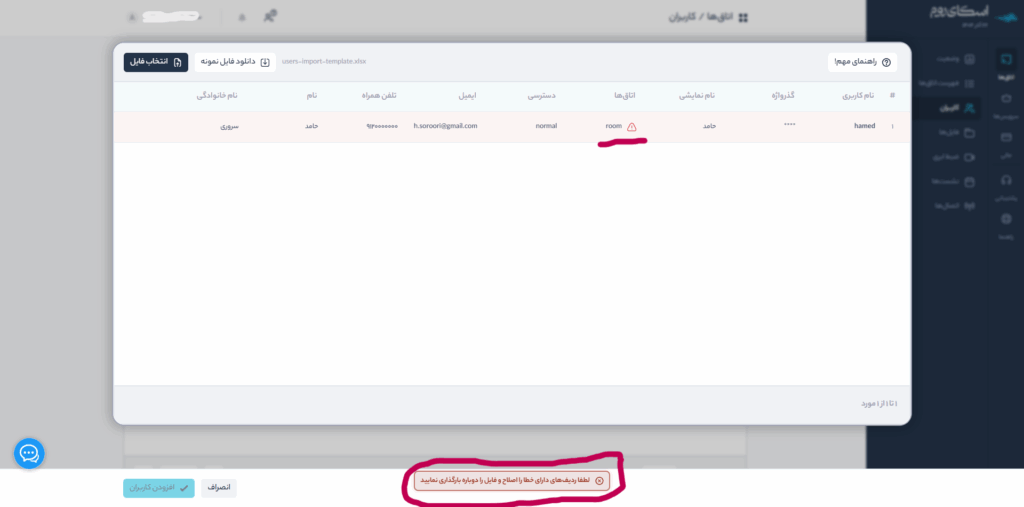 در نظر داشته باشید که در حین وارد کردن گروهی اسامی، ممکن است به دلیل درست پر نکردن موارد خواسته شده (یا ناقص بودن اطلاعات)، با صفحه زیر مواجه شوید. در این صورت، نیاز است همان فایل شیت (جدول) که بر اساس فرمت اسکایروم پر کرده بودهاید را دوباره بازبینی و اصلاح کرده و مجدد آپلود کنید.