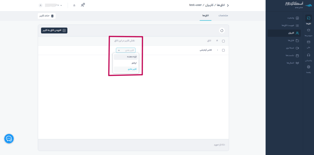 پس از سپری کردن این مرحله، در پنجره اصلی کاربر و بخش اتاقها، میتوانید مشاهده کنید که نام کاربری ساخته شده به کلاسی که میخواهید، متصل شده است. از همین بخش میتوانید نقش کاربر را تعیین کنید؛ یعنی زمانی که شخصی با این نام کاربری و رمز عبور وارد کلاس میشود، از همان ابتدا چه سطح از دسترسی را داشته باشد: