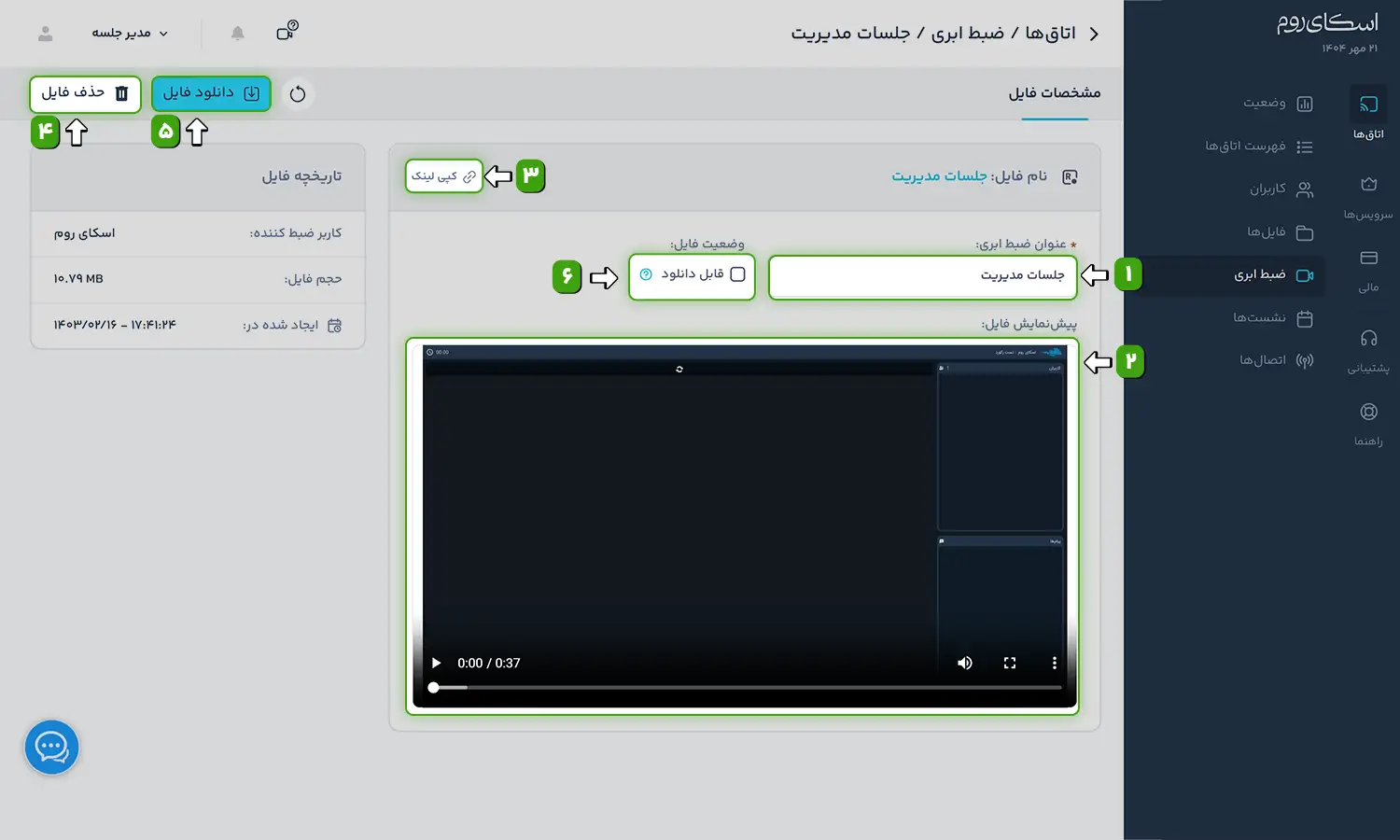درصفحه ای که مشاهده میکنید امکان مدیریت آن ها، ویراش عنوان ضبط ابری، کپی کردن لینک، پیش نمایش فایل، حذف فایل، دانلود فایل ضبط شده و مدیریت دانلود فایل ضبط شده را خواهید داشت