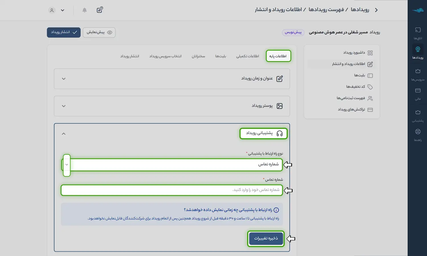 درقسمت پشتیبانی رویداد می توانید یک راه ارتباطی در دسترس برای برنامه خود تعیین نمایید، تا شرکت‌کنندگان بتوانند در صورت بروز مشکل یا سوال احتمالی ارتباط برقرار کنند.