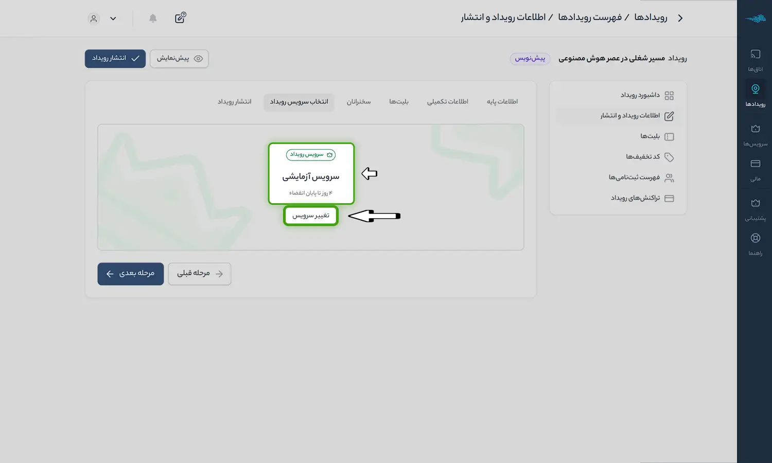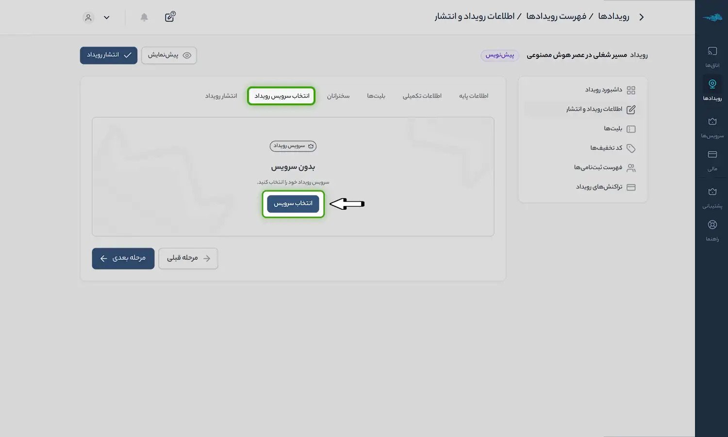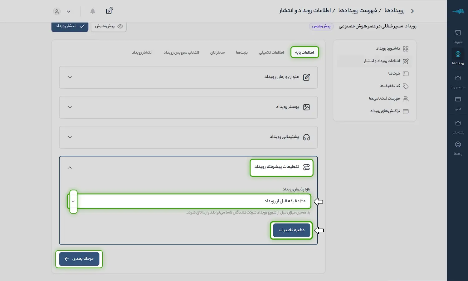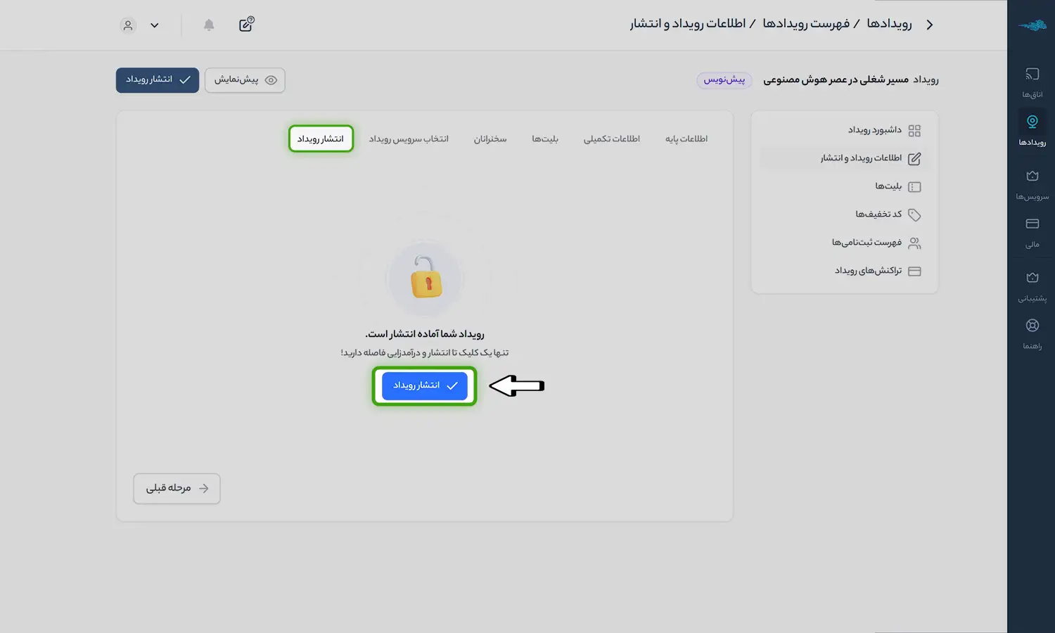 در این بخش، برگزارکننده می‌تواند رویداد را منتشر کند. در صورت ناقص بودن اطلاعات ضروری، موارد تکمیل‌نشده در همین صفحه نمایش داده می‌شود و با انتخاب هر مورد، به بخش مربوطه جهت تکمیل اطلاعات هدایت خواهد شد.