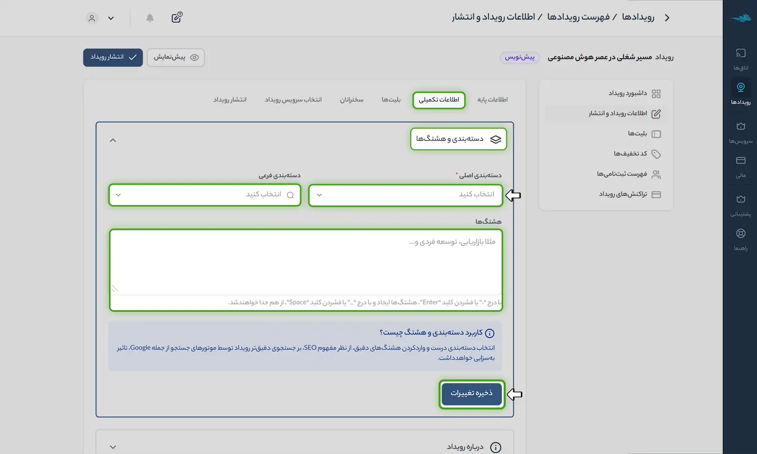 در این مرحله میتونید دسته بندی ها و هشتگ های رویدادتون را انتخاب کنید.انتخاب دسته‌بندی درست و وارد‌کردن هشتگ‌های دقیق، از نظر مفهوم SEO، بر جستجوی دقیق‌تر رویداد توسط موتور‌های جستجو از جمله Google، تاثیر به‌سزایی خواهد‌داشت.