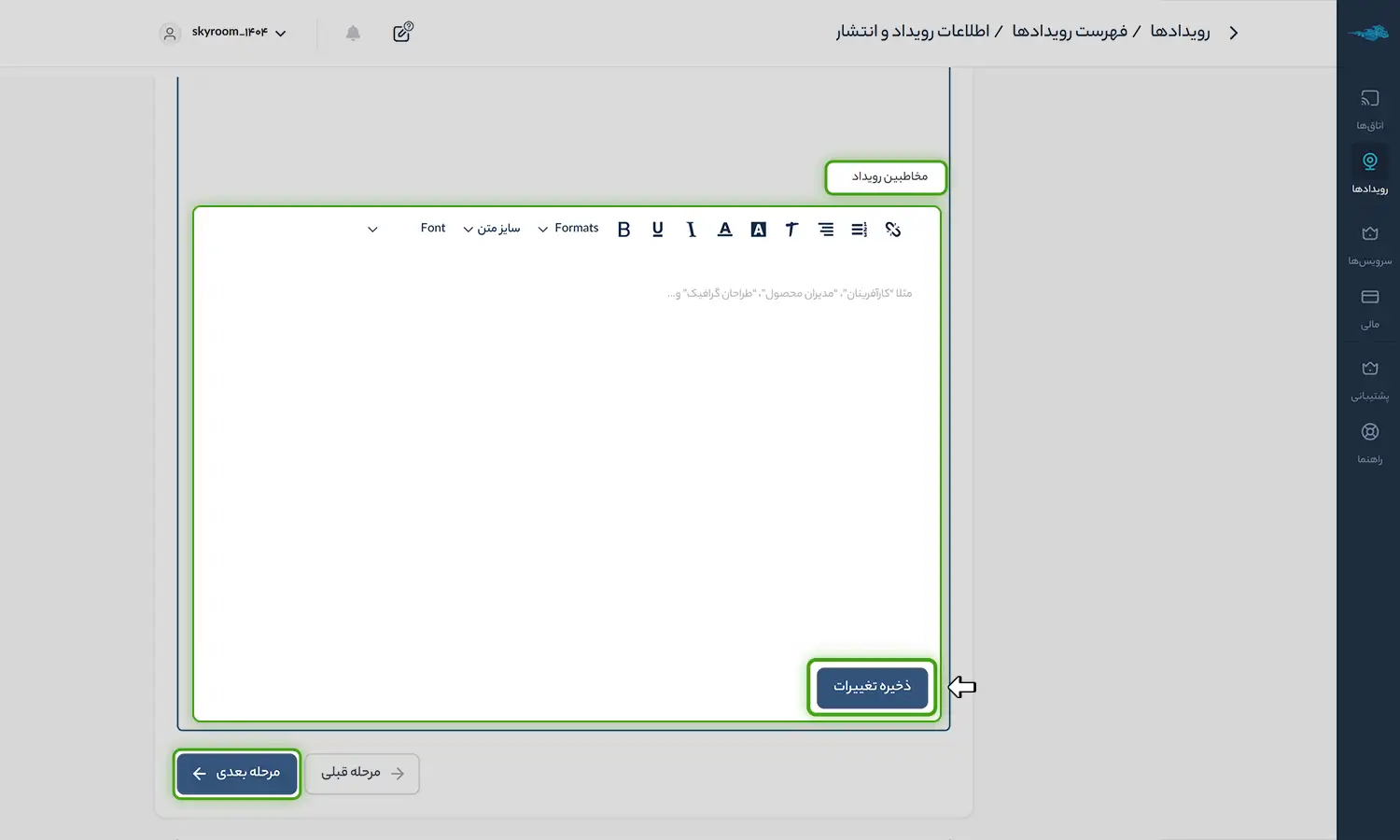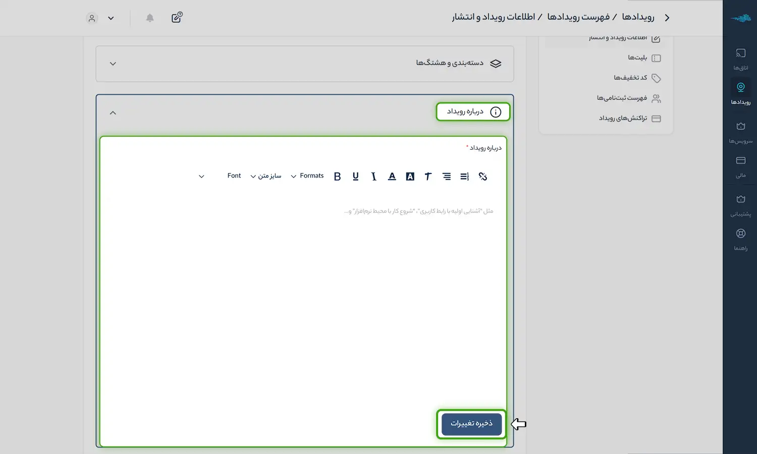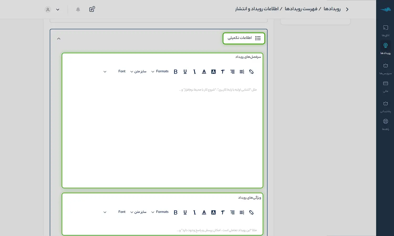 در این بخش می توانید توضیحات کامل رویداد خود را وارد کنید.تکمیل این بخش الزامی است و متن باید حداقل ۵۰ کاراکتر داشته باشد. این اطلاعات به مخاطبین کمک میکند تا بهتر با رویداد آشنا شوند و تصمیم بگیرند که در آن شرکت کنند.