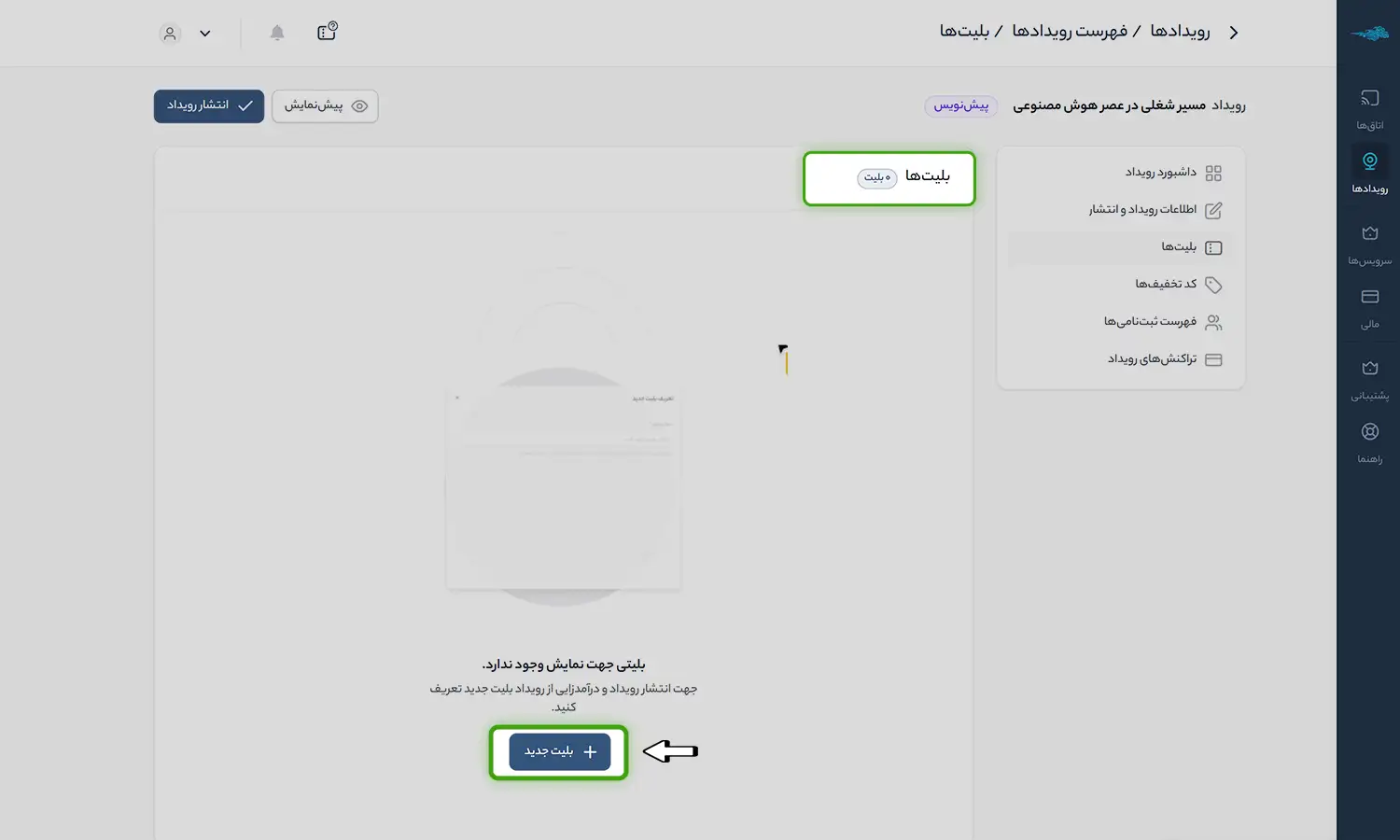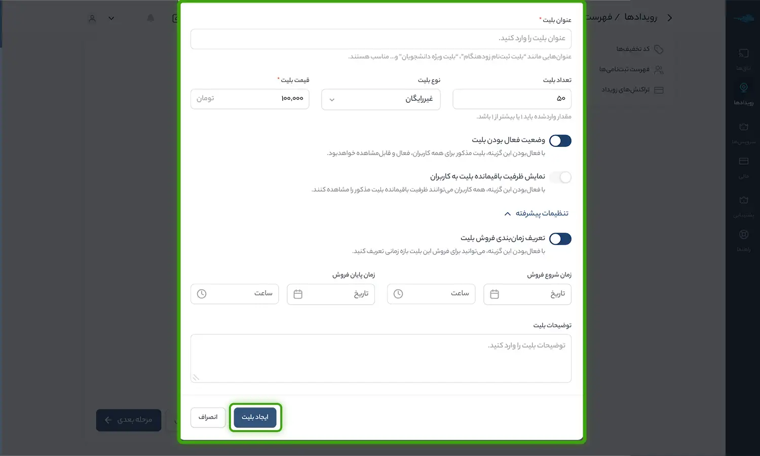 در این بخش می توانید بلیت های موردنظر خود را برای رویداد تعریف کنید. هر بلیت می تواند عنوان، توضیحات، ظرفیت، قیمت و سایر تنظیمات مخصوص خود را داشته باشد. برای اینکه شرکت کنندگان بهتر با نوع بلیت آشنا شوند، پیشنهاد می شود عنوان مشخص و توضیح کوتاه اما کاربردی برای هر بلیت ثبت شود.(توضیحات کامل و شفاف به شرکت کنندگان کمک می کند تا بهترین انتخاب را داشته باشند و روند فروش بلیت شما نیز روان تر انجام شود)