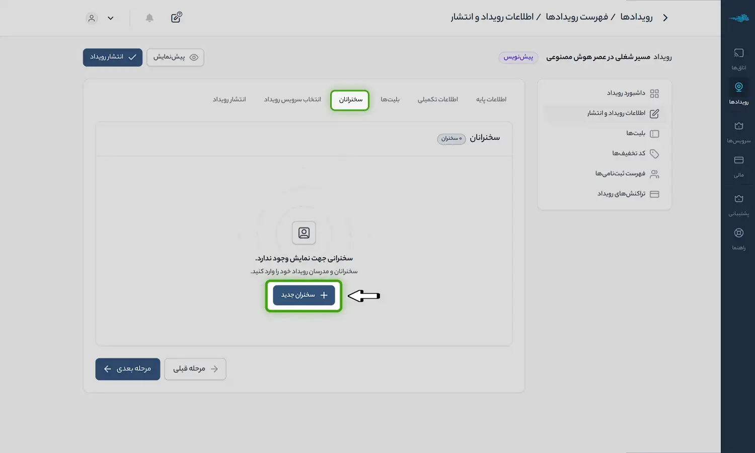 در صفحه ای که سخنران های اضافه شده اند، بخش های زیر قابل مشاهده هست