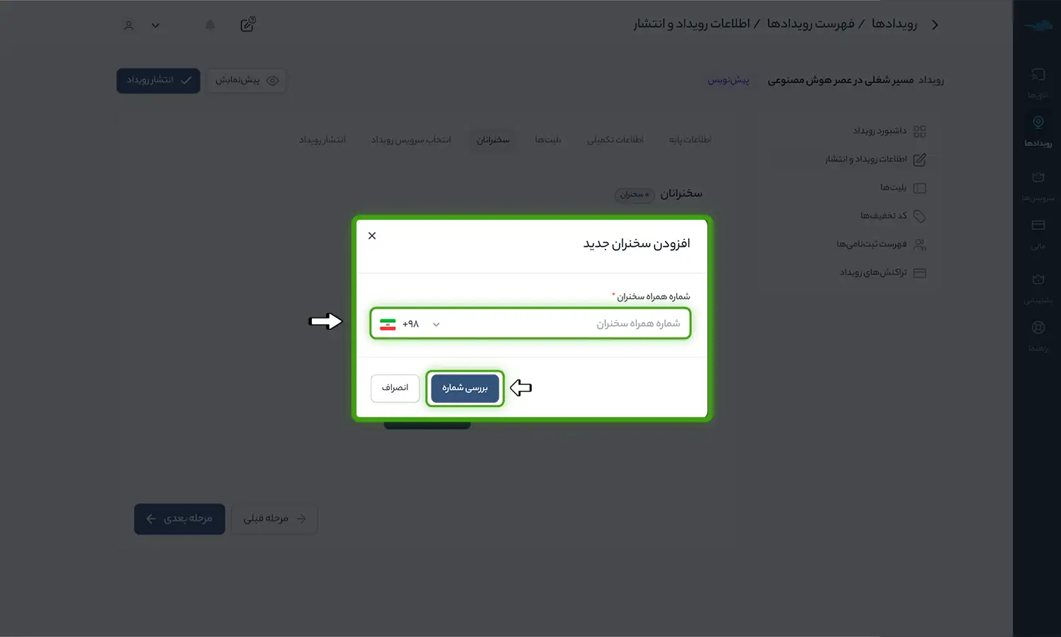 شماره تماس سخنران را وارد نمایید، سیستم شماره وارد شده را بررسی می‌کند و در صورت پیدا شدن، اطلاعات سخنران نمایش داده می‌شود.