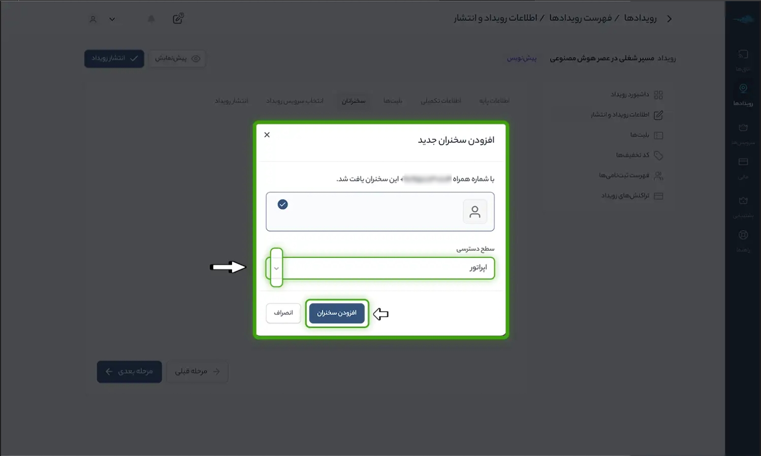 پس از کلیک کردن روی افزودن سخنران، سخنران به رویداد اضافه شده و سطح دسترسی مطابق نقش تعیین می‌شود.