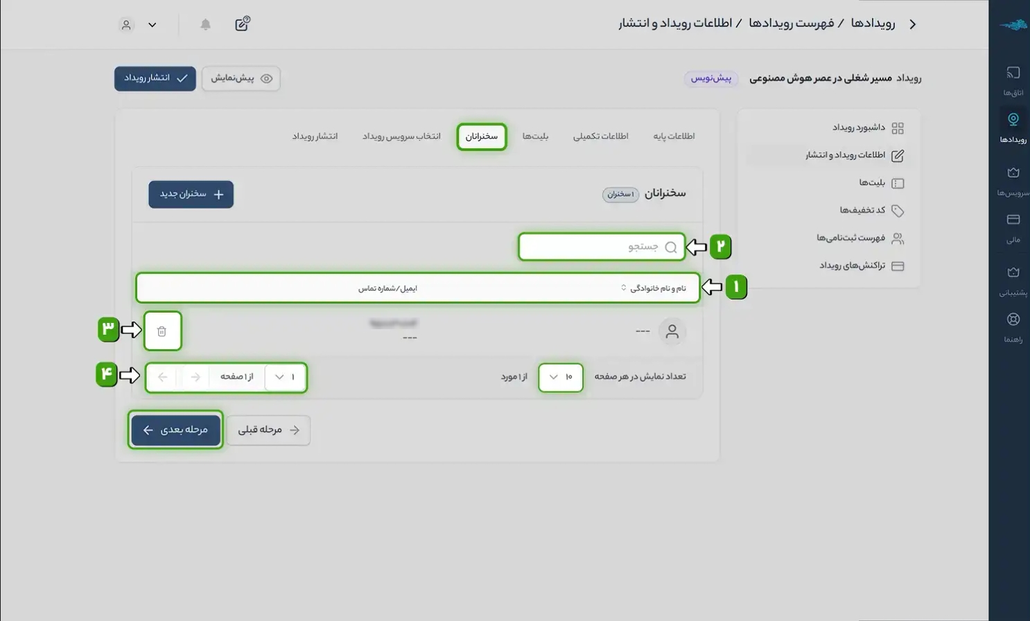 در این بخش، نام و نام خانوادگی هر سخنران به‌همراه اطلاعات ثبت‌نامی شماره تماس نمایش داده می‌شود تا امکان مشاهده سریع و دقیق مشخصات هر فرد فراهم باشد.