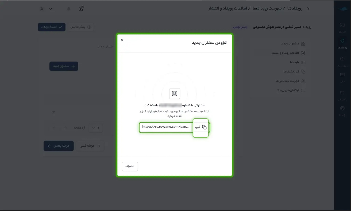 اگر هنگام جستجوی سخنران، شماره تماس او در سیستم یافت نشود، پیغامی به برگزارکننده نمایش داده می‌شود. در این وضعیت، برگزارکننده می‌تواند لینک همان صفحه را برای فرد ارسال کند تا ابتدا اطلاعاتش را در سیستم ثبت کند. پس از تکمیل ثبت‌نام، برگزارکننده می‌تواند دوباره به بخش سخنران‌ها مراجعه کرده و او را به سیستم اضافه نماید