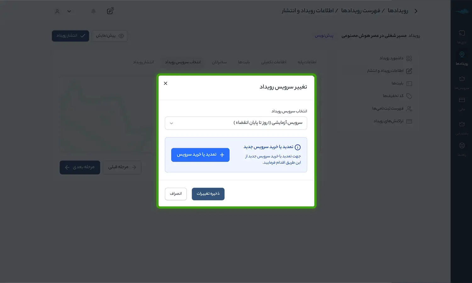 همچنین داشبورد رویداد به طور هوشمند بر اساس وضعیت جاری رویداد، امکانات ویژه و مناسب با هر مرحله را فعال یا غیرفعال می نمایید.