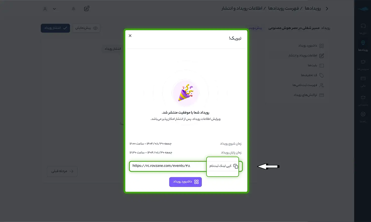پس از انتشار رویداد، گزینه‌های «ورود به اتاق» و «کپی لینک اتاق»، «پیش نمایش صفحه ثبت نام » به صفحات داشبورد مربوط به آن رویداد اضافه می‌شوند. برگزارکننده می‌تواند از این بخش‌ها برای دسترسی سریع به اتاق رویداد و اشتراک‌گذاری لینک با شرکت‌کنندگان و مشاهده صفحه ثبت نام استفاده کند.