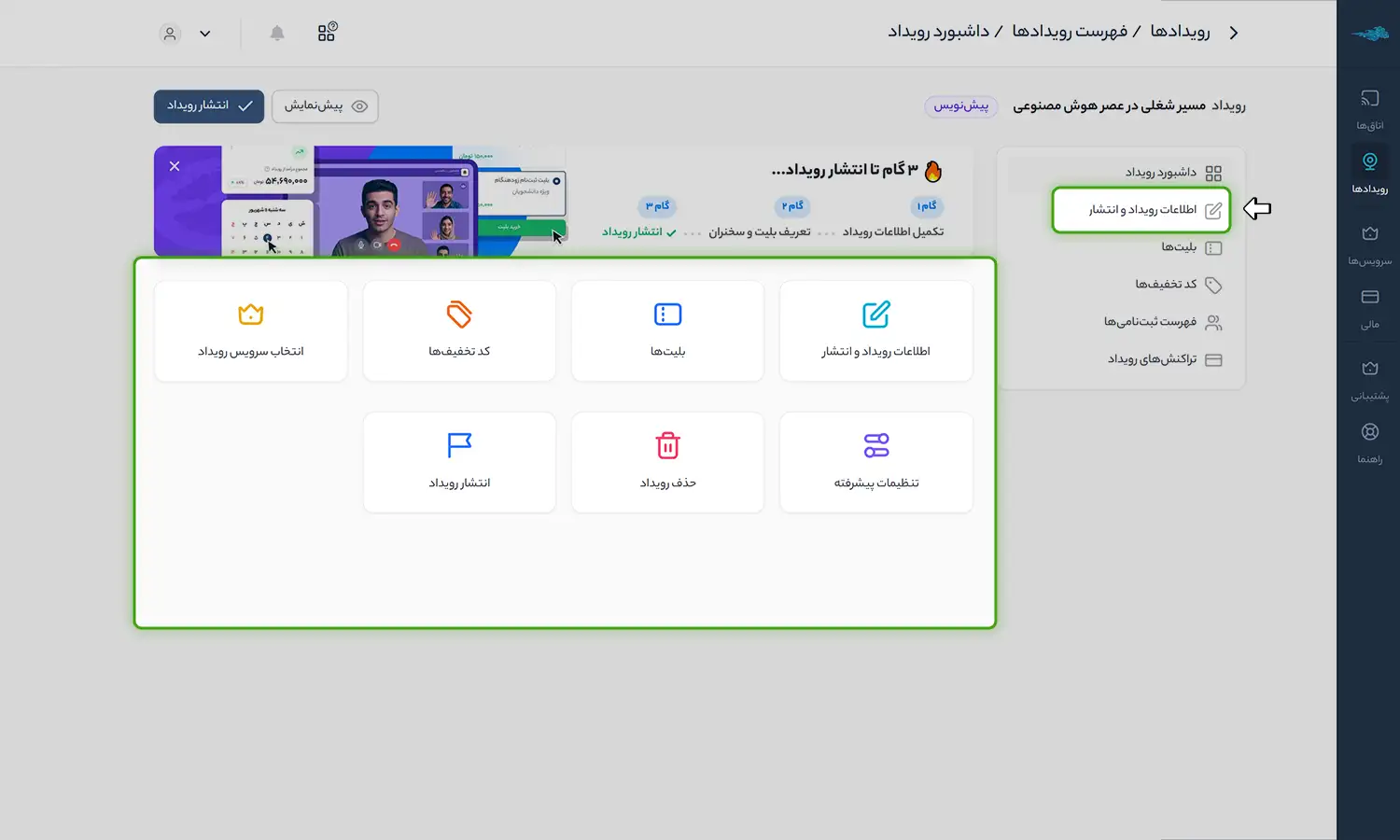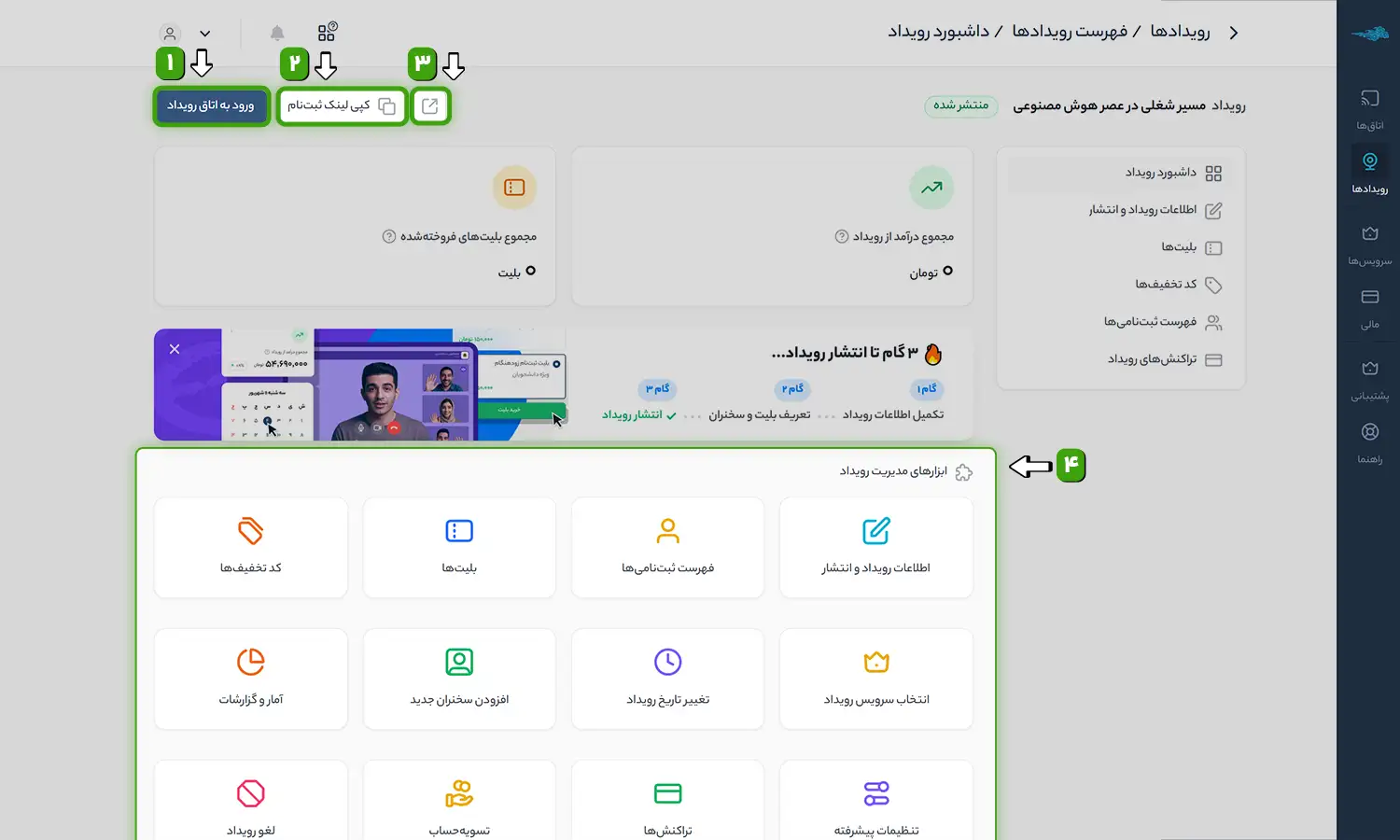در داشبورد رویداد، متناسب با وضعیت فعلی رویداد(پیش نویس، در حال برگزاری، تمام شده یا لغو شده)، مجموعه ای از امکانات و عملیات مرتبط در دسترس شما قرار میگیرد.