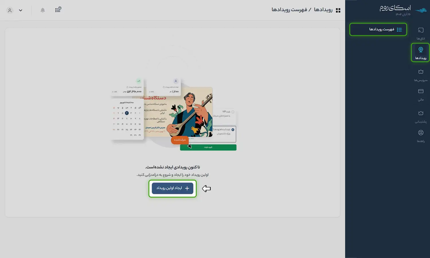 با کلیک کردن روی ایکون ایجاد اولین رویداد وارد این بخش شده