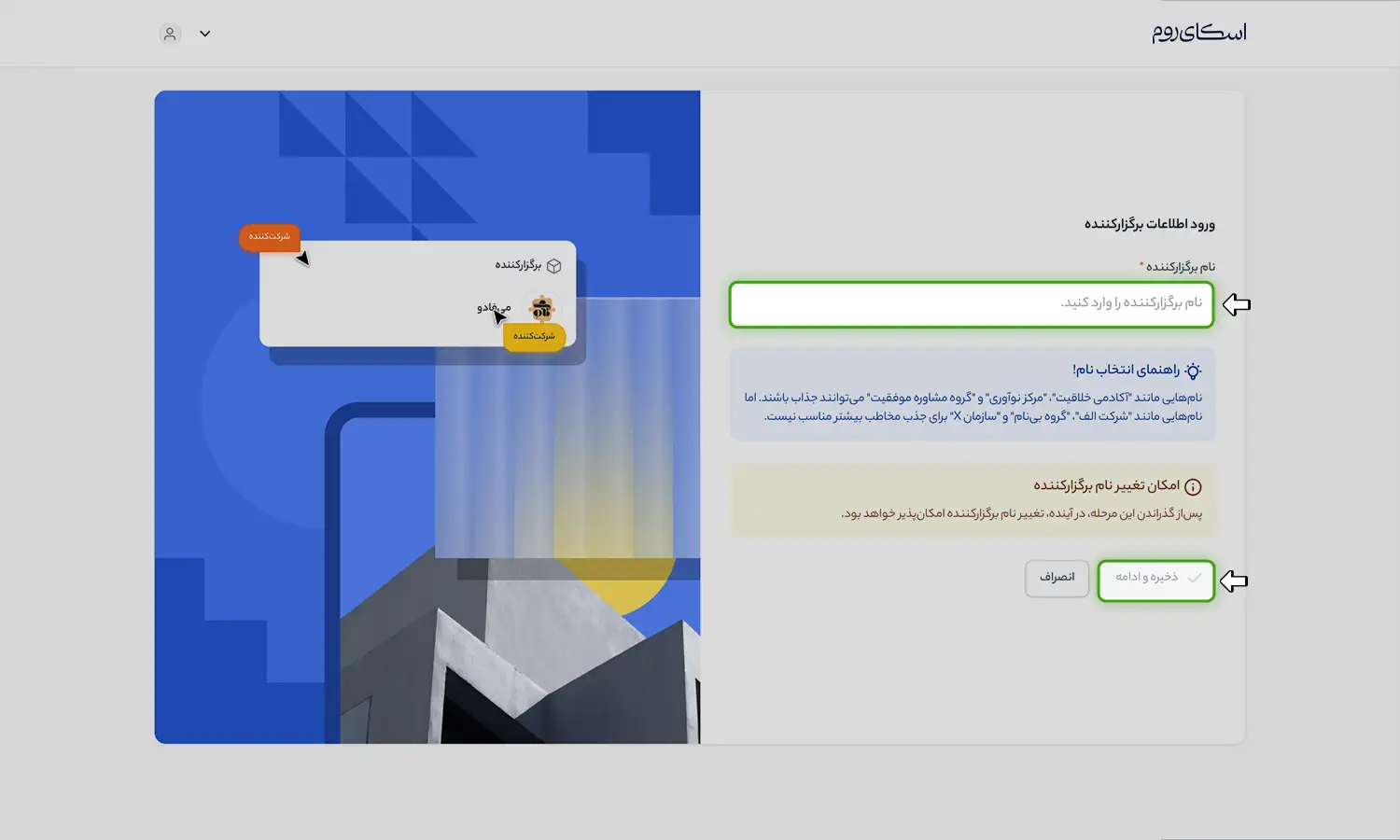 در کادر نام برگزار کننده با توجه به حوزه برگزاری رویداد وارد نمایید. نامی که مشخص میکنید در جذب مخاطب مناسب باشد.(بعد از گذراندن این مرحله امکان تغییر نام برگزارکننده نیز وجود خواهد داشت)