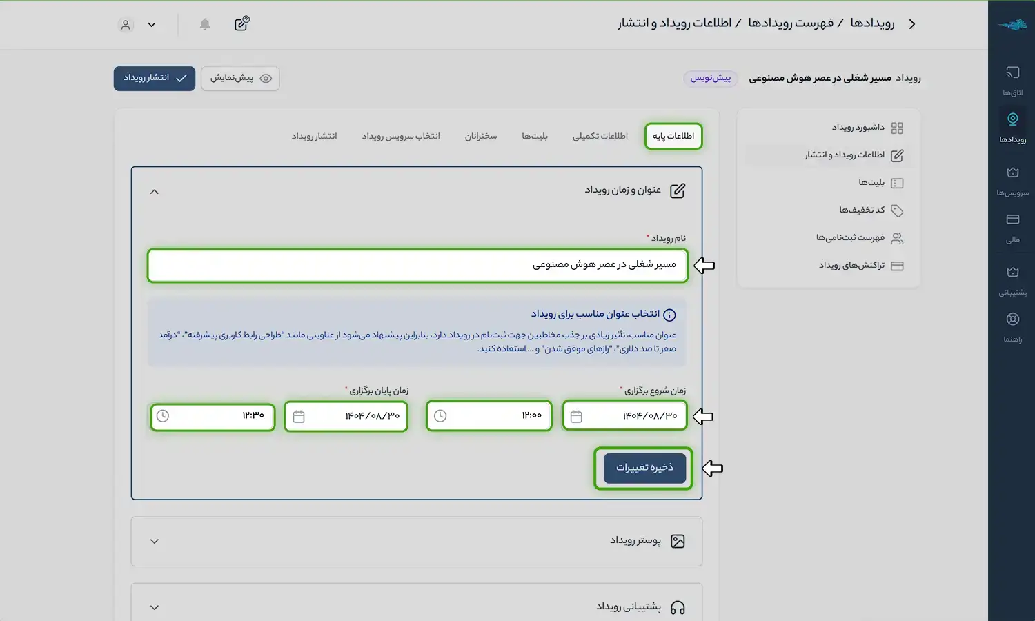 با کلیک کردن روی اطلاعات رویداد و انتشار وارد این بخش می شوید