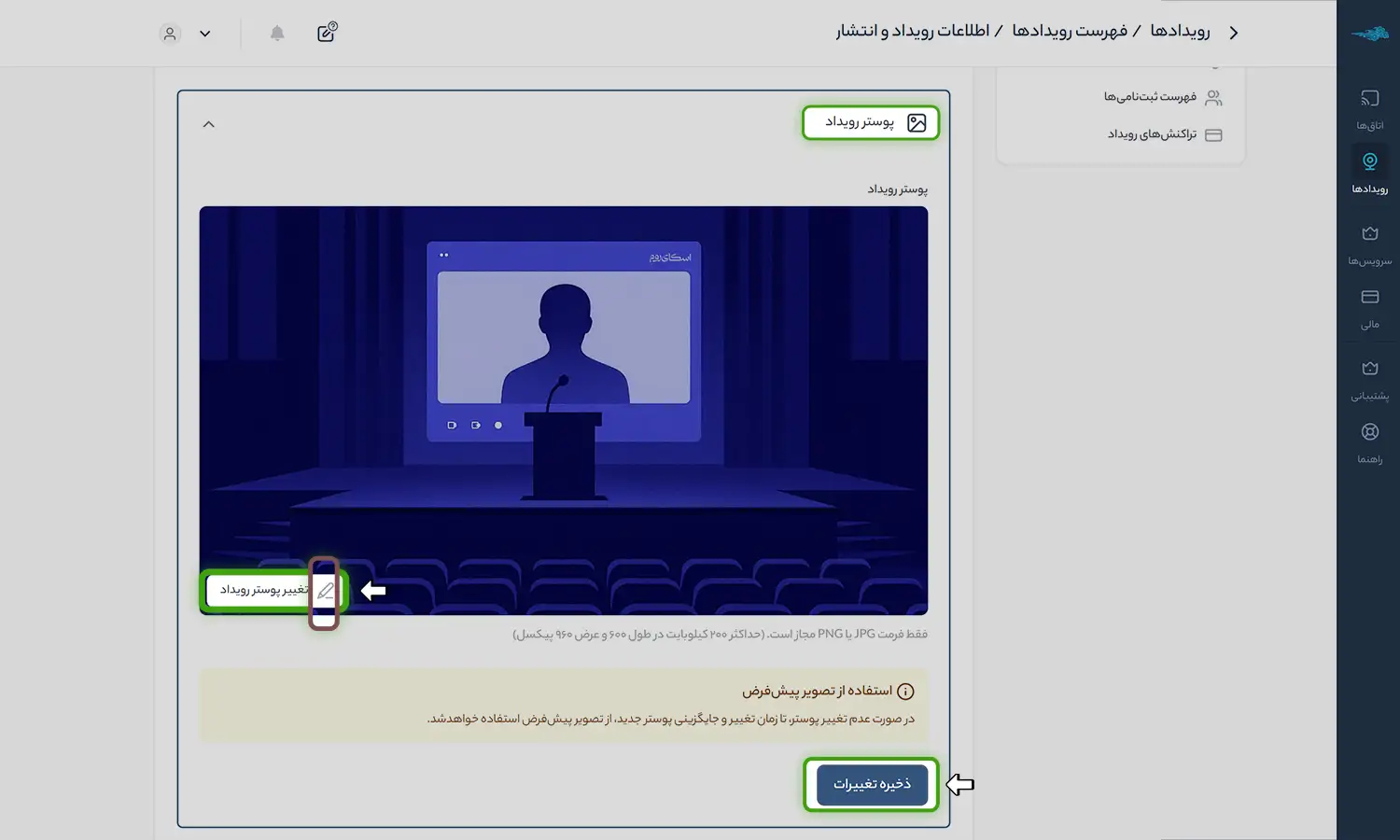 پوستر ویترین رویداد شماست و یه تصویر جذاب میتونه تاثیر زیادی در جذب مخاطب داشته باشد. توجه کنید که فرمت JPG یا PNG مجاز است. (حد‌اکثر ۲۰۰ کیلو‌بایت در طول ۶۰۰ و عرض ۹۶۰ پیکسل).درصورت انتخاب نکردن تصویر،پوستر پیش فرض برای رویداد شما استفاده خواهد شد.
