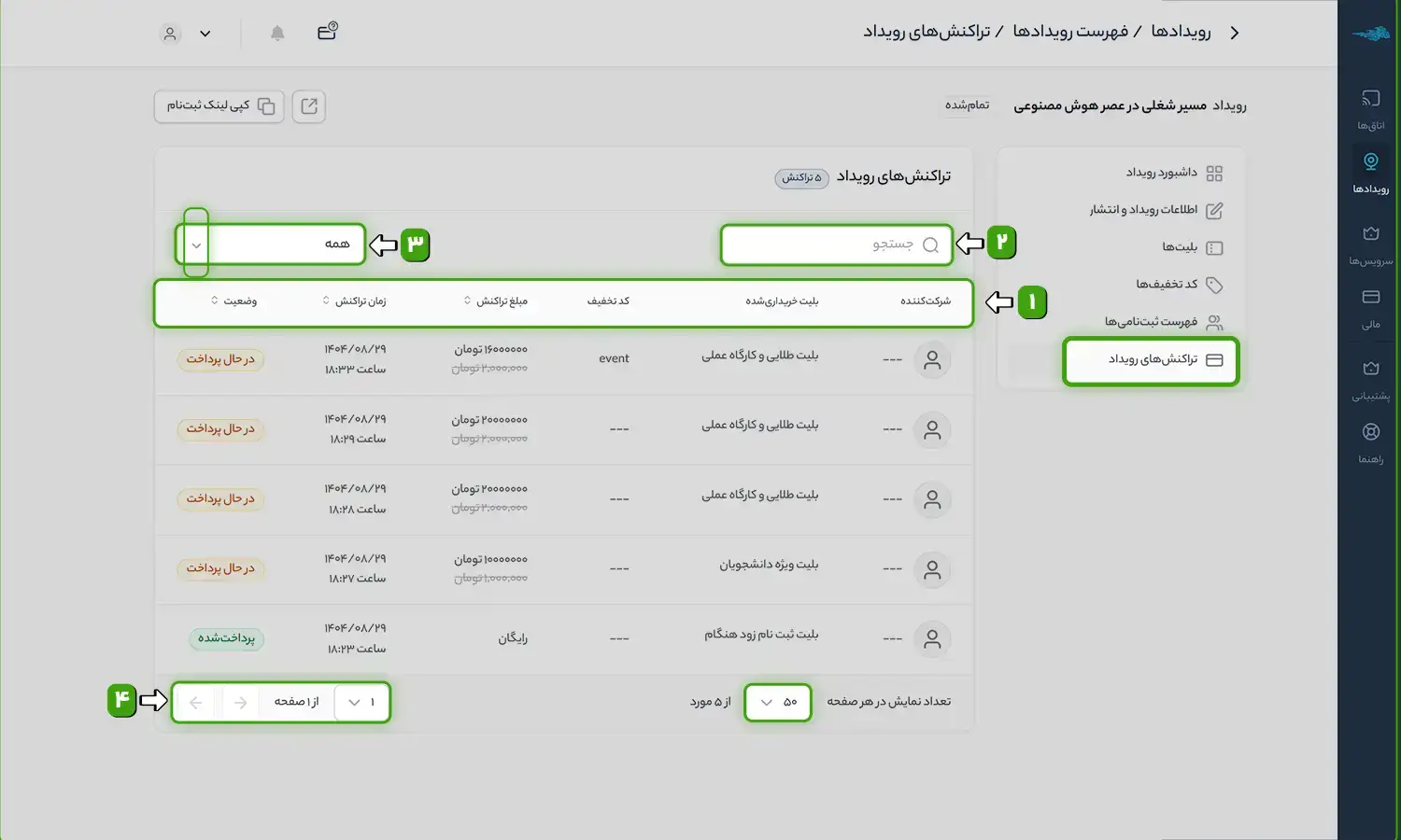 در این بخش، تمام تراکنش‌های مربوط به رویداد ثبت می‌شود. هر زمان شرکت‌کننده وارد مرحله پرداخت شود.چه پرداخت کامل شود، چه در حالت پرداخت باقی بماند یا ناموفق باشد جزئیات آن در این صفحه قابل مشاهده است. این بخش به برگزارکننده کمک می‌کند وضعیت مالی رویداد را دقیق و شفاف مدیریت کند.