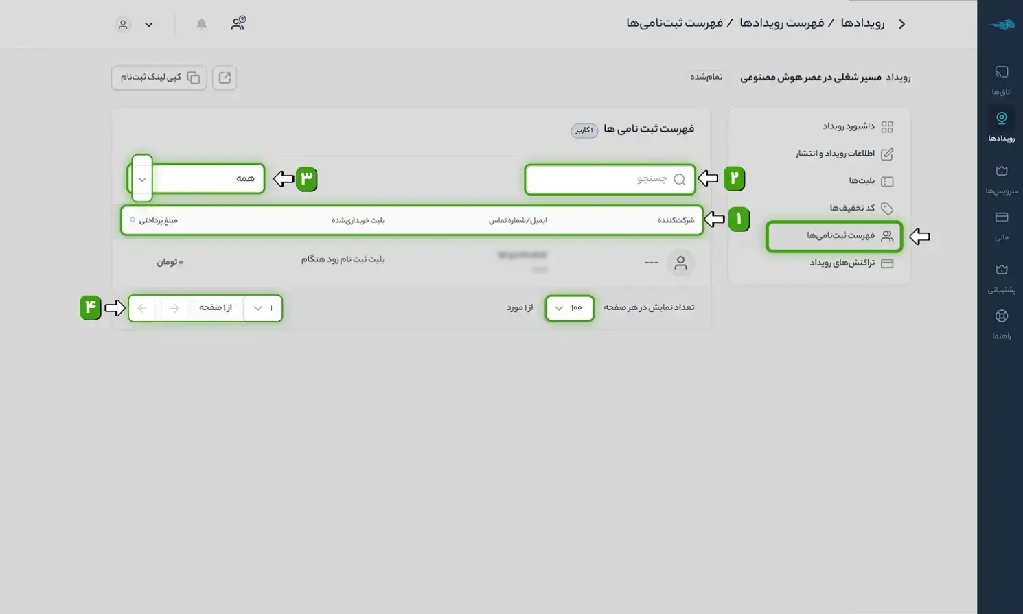 از طریق گزینههای فیلتر میتوانید نمایش لیست را محدود کنید؛ مانند نمایش همه ثبتنامیها یا نمایش افراد مرتبط با یک بلیت مشخص.