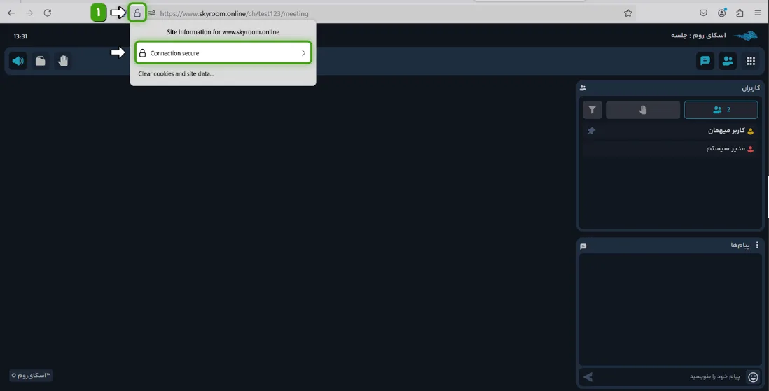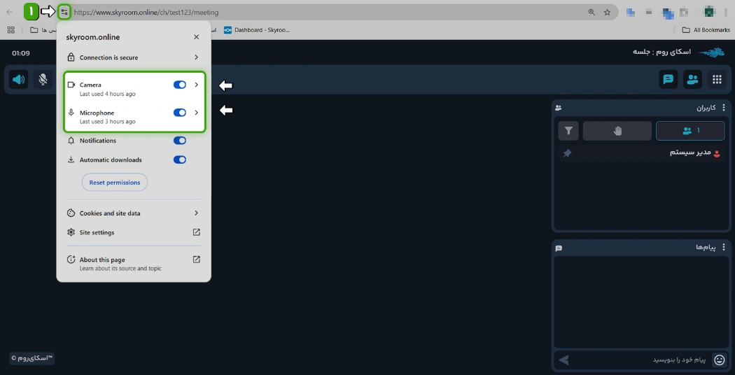 برای رفع مشکل “اجازه دسترسی مرورگر به میکروفون داده نشده است” در صورت دریافت این پیام، در محیط اتاق روی آیکون قبل از آدرس سایت قرار گرفته کلیک کنید. دسترسی مرورگر به Microphone    باید در وضعیت “Allow” باشد.