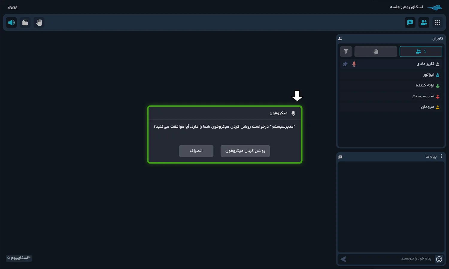 پس از دریافت پیغام فعالسازی میکروفون که از طرف اپراتور برای شما ارسال می شود، می توانید با انتخاب گزینه “روشن کردن میکروفون” میکروفون خود را فعال نموده و با سایر کاربران اتاق، ارتباط شنیداری برقرار کنید.