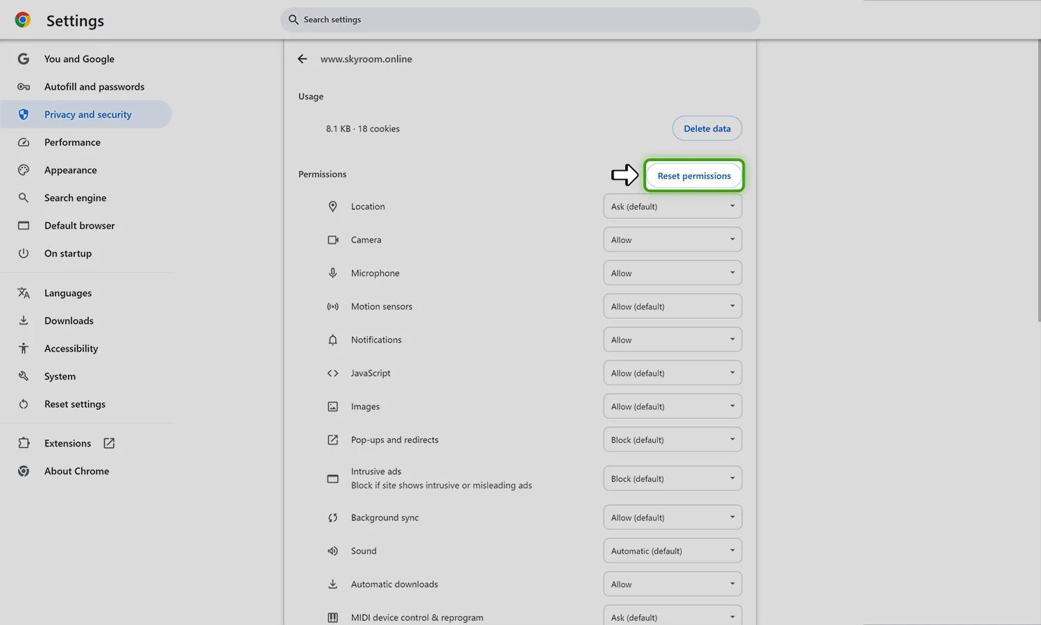 در صورت دریافت مجدد خطا روی “Site settings” کلیک نمایید و در بخش “Advanced” روی “Reset permissions” کلیک نمایید. و مجدد دسترسی بدهید.