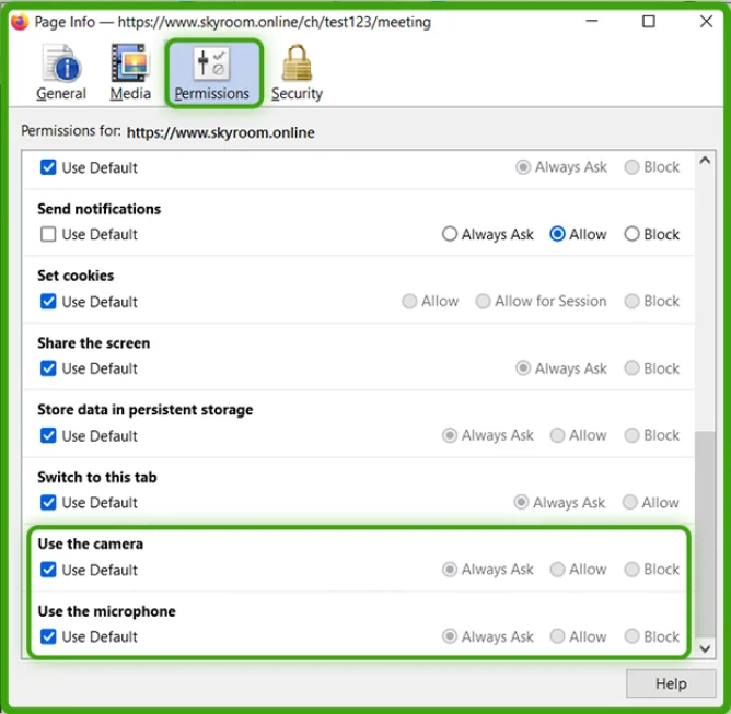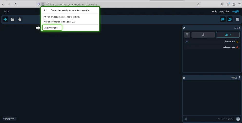 روی آیکون کنار لینک اتاق کلیک کنید و “Connection secure” را انتخاب نمایید. سپس روی “more informations” کلیک نمایید. به سربرگ “permissions” رفته  و تیک گزینه های use the microphone   و use the camera  را فعال کنید