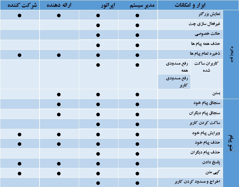 در پنجره چت با توجه به نقش شما، میزان دسترسی شما به ابزارها و امکانات هربخش متفاوت است. به همین دلیل برای سهولت آشنایی، ابزارهای این پنجره به تفکیک نقش معرفی شده‌اند.
