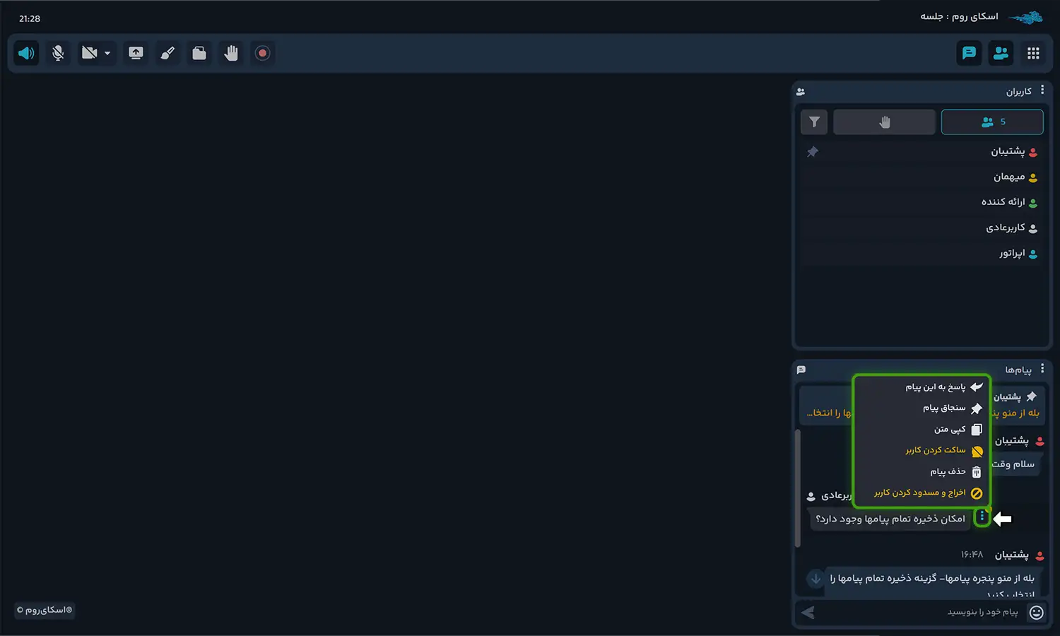 علاوه بر این می‌توانید با انتخاب علامت “سه نقطه” در سمت راست پیام کاربران، به امکان  پاسخ به این پیام،سنجاق پیام،کپی متن،ساکت کردن کاربر،حذف پیام و اخراج و مسدود کردن کاربر دسترسی داشته باشید