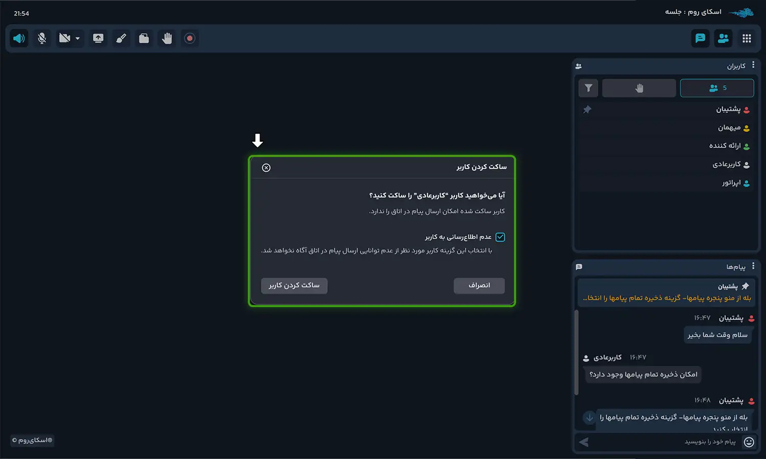 ساکت کردن کاربر:  با انتخاب این گزینه، کاربر امکان ارسال پیام را نخواهد داشت. چنانچه در کادر باز شده عدم اطلاع رسانی به کاربر را فعال نمایید، کاربر مورد نظر از عدم امکان ارسال پیام در اتاق مطلع نخواهد شد.