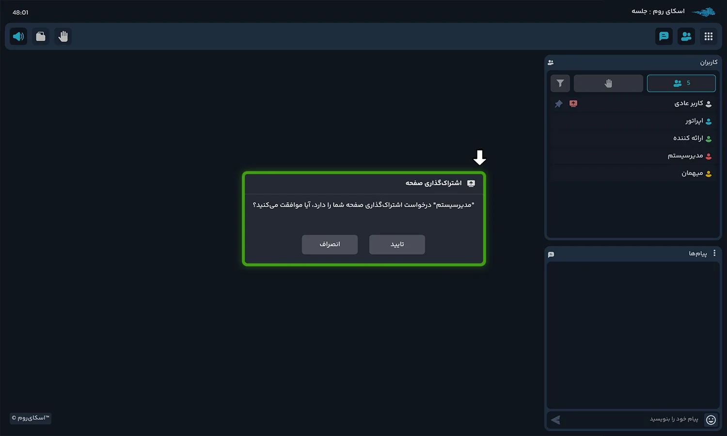 جهت نمایش صفحه کامپیوتر خود به سایر کاربران، میتوانید از امکان “اشتراک دسکتاپ” استفاده کنید. دسترسی به اشتراک دسکتاپ، به طور پیشفرض تنها در اختیار مدیرسیستم، اپراتور و ارائهدهنده قرار گرفته است. در صورت تاییدمدیرسیستم یا اپراتور، دسترسی به اشتراک دسکتاپ برای کاربر عادی یا میهمان نیز فعال میشود.