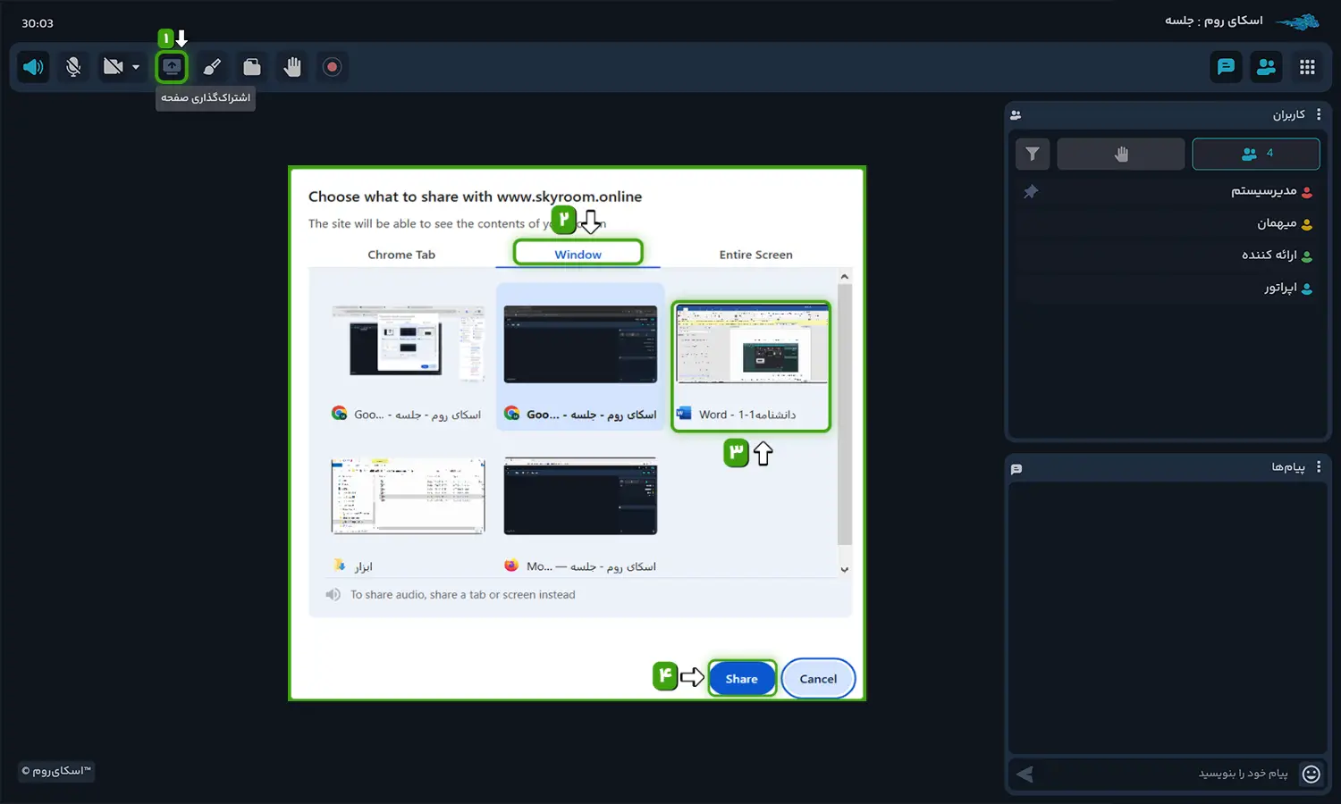 پس از انتخاب پنجره مورد نظر خود روی دکمه “Share” کلیک کنید تا اشتراکگذاری تصویر آغاز شود.