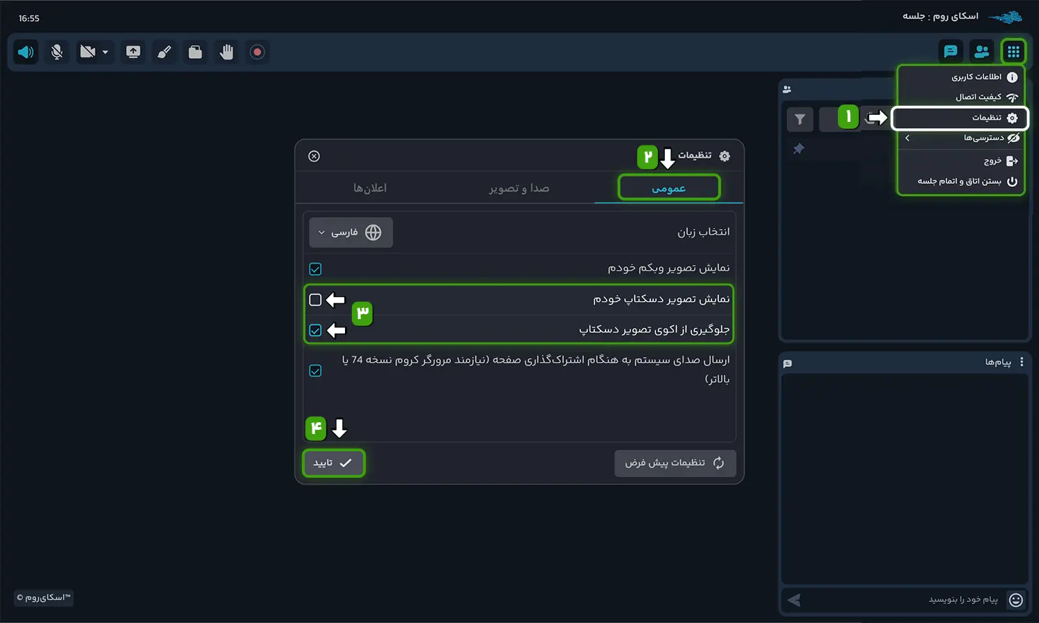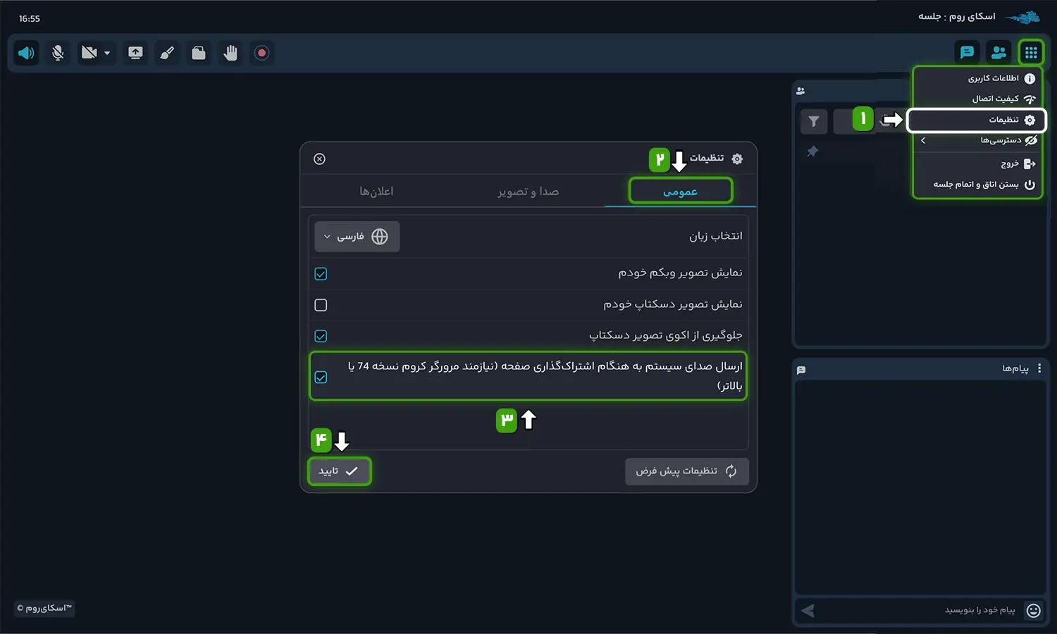 برای اشتراکگذاری صدای پخش شده در دسکتاپ شما به همراه تصویر دسکتاپ باید از منوی برنامه > تنظیمات > عمومی گزینه ارسال صدای سیستم به هنگام اشتراک دسکتاپ را فعال نمایید. با فعالسازی این گزینه، در پایین پنجره اشتراک دسکتاپ گزینه also share system audio اضافه خواهد شد که باید تیک این گزینه را نیز فعال بفرمایید.